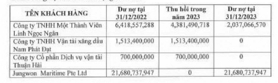 Trong năm 2023, TOS cũng đã xóa một số khoản công nợ khác, điển hình như trường hợp Công ty TNHH Vận tải xăng dầu Nam Phát Đạt hơn 1,5 tỷ đồng, Cômng ty CP Dịch vụ vận tải Thuận Hải 700 triệu đồng. Riêng khoản công nợ có giá trị khá lớn tại Jungwon Maritime Pte Ltd gần 22 tỷ đồng chưa được xử lý dứt điểm.