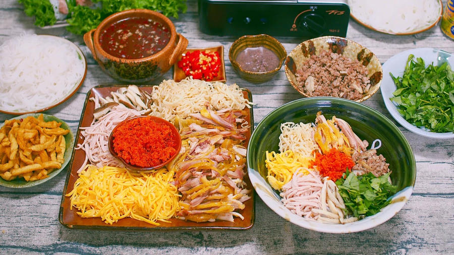 Gia đình tôi thường chọn các món truyền thống như gà luộc, xôi gấc, canh măng miến, giò lụa và nem rán. Chuẩn bị một mâm cỗ thế này chỉ mất khoảng 1 giờ".