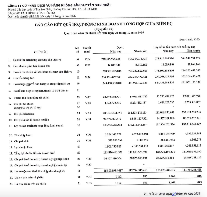 Công ty cổ phần Dịch vụ Hàng không Sân bay Tân Sơn Nhất (SASCO, mã ck: SAS) vừa công bố báo cáo tài chính tổng hợp quý I/2026 với kết quả kinh doanh ấn tượng.