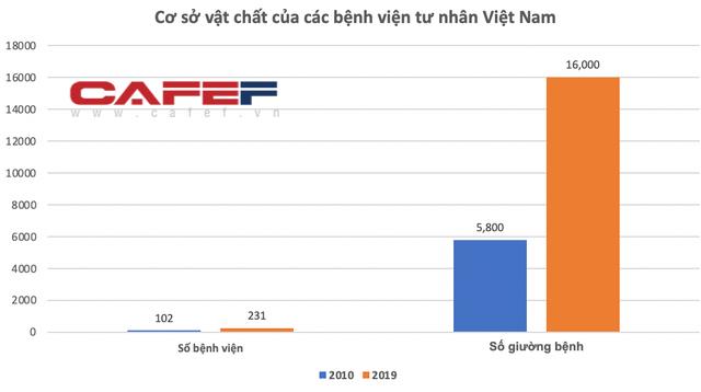 Số bệnh viện tư nhân tăng từ 102 bệnh viện năm 2010 lên 231 bệnh viện năm 2019, số giường bệnh cũng tăng từ 5.800 giường lên 16.000 giường bệnh (5% tổng số giường bệnh, 1,7 giường trên 1 vạn dân) và trên 35.000 phòng khám tư nhân, góp phần đáng kể vào cung cấp dịch vụ y tế, cả khám chữa bệnh và phòng bệnh (cung cấp 43% dịch vụ ngoại trú và 2,1% tổng số dịch vụ nội trú).