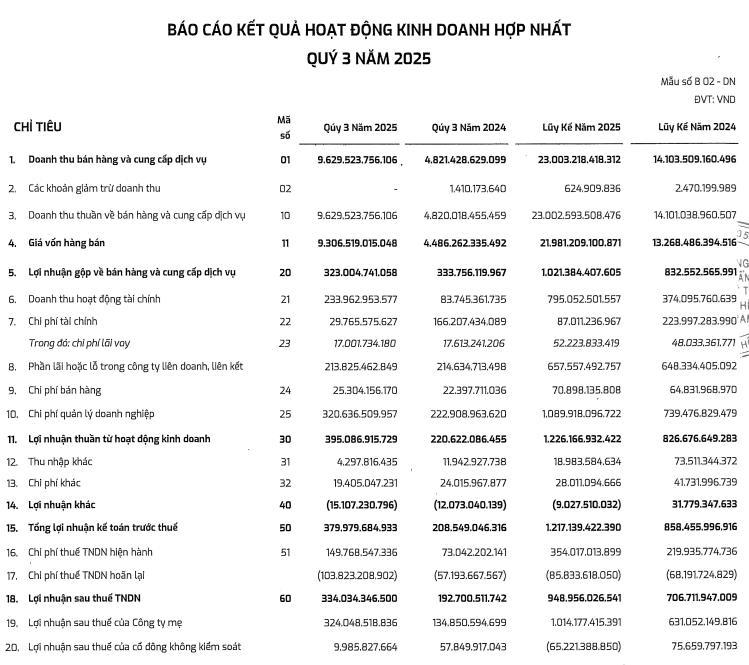Theo đó, trong quý III/2025, doanh nghiệp báo doanh thu đạt 9.629 tỷ đồng, tăng gấp đôi so với cùng kỳ năm ngoái. Do giá vốn tăng mạnh hơn với 107%, khiến lợi nhuận gộp doanh nghiệp giảm 3%, còn 323 tỷ đồng.
