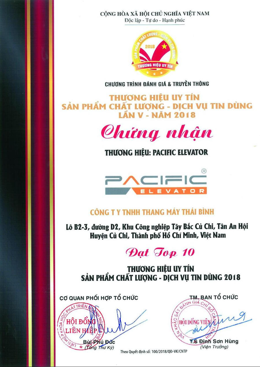 Là thương hiệu tiên phong trong lĩnh vực sản xuất thang máy với gần 30 năm kinh nghiệm tại Việt Nam, tính tới thời điểm hiện tại Công ty Thang máy Pacific (Pacific Elevator Vietnam) đã đưa vào thị trường hơn 15.000 thang chất lượng cao, tự hào là một trong những đơn vị uy tín hàng đầu với một loạt các danh hiệu như: Chứng nhận Quốc tế CSI (Chỉ số hài lòng khách hàng), Giải thưởng Đảm bảo chất lượng QAS, Top 10 Thương hiệu Tiêu biểu Châu Á – Thái Bình Dương...