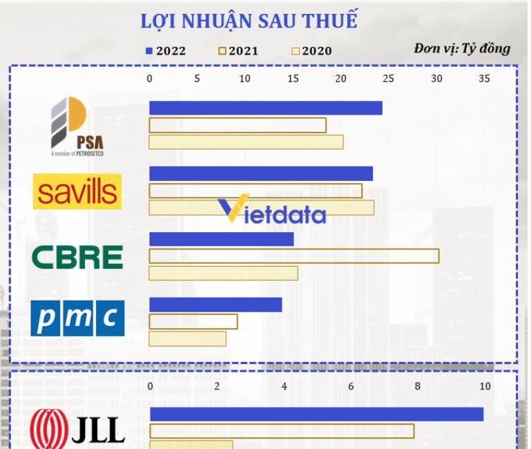 Tuy nhiên, trái ngược với sự vượt trội về doanh thu thì báo cáo của Vietdata cũng cho lợi nhuận sau thuế của các tên tuổi hàng đầu thế giới trong lĩnh vực dịch vụ bất động sản, dịch vụ quản lý tòa nhà lại không mấy tích cực, thậm chí kém xa một doanh nghiệp trong nước vốn có doanh thu thấp hơn đáng kể là Công ty Cổ phần Quản lý và Khai thác Tài sản PSA.