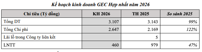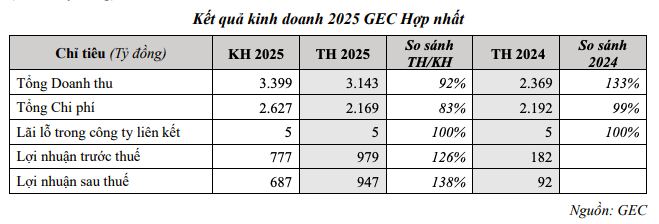 Theo tài liệu công bó, khép lại năm 2025, GEG ghi nhận doanh thu thuần đạt 3.143 tỷ đồng, lãi sau thuế đạt 947 tỷ đồng, lần lượt thực hiện được 92% doanh thu và vượt 38% kế hoạch đề ra về lợi nhuận.