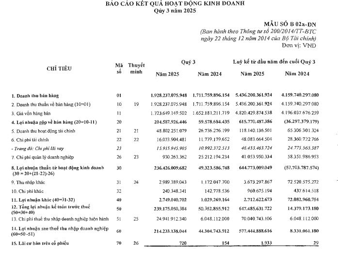 Lũy kế 9 tháng năm, doanh thu thuần của doanh nghiệp đạt 5.436,2 tỷ đồng, tăng 30% và lãi sau thuế đạt 577,4 tỷ đồng, gấp gần 70 lần mức lãi 8,3 tỷ đồng cùng kỳ năm trước.