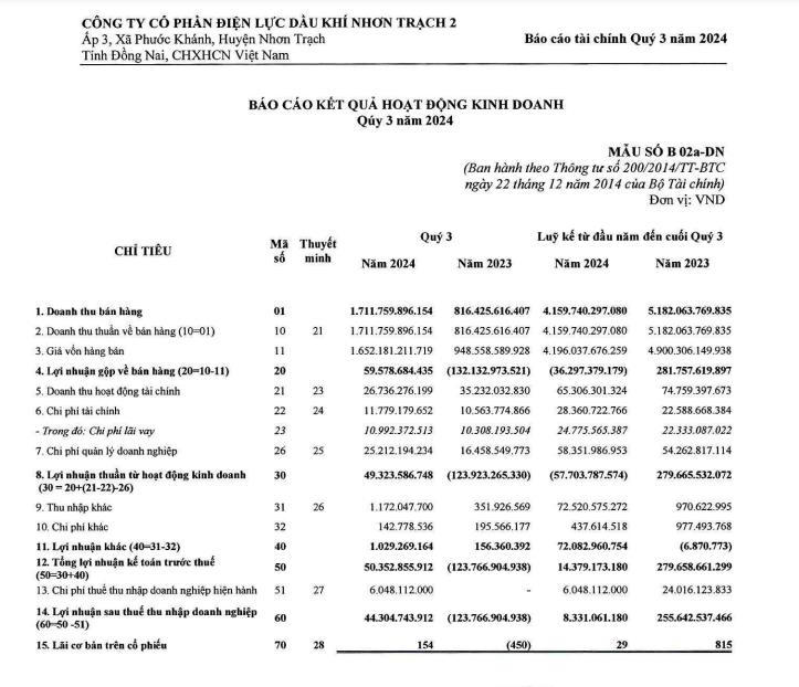 Tính chung 9 tháng đầu năm 2024, Nhơn Trạch 2 mang về 4.159,7 tỷ đồng doanh thu thuần và hơn 8,3 tỷ đồng lợi nhuận sau thuế, lần lượt giảm 20% và 97% so với cùng kỳ năm 2023. Điểm sáng là Nhơn Trạch 2 có khoản lợi nhuận khác lên tới 72 tỷ đồng trong khi cùng kỳ lỗ 6,8 triệu đồng.