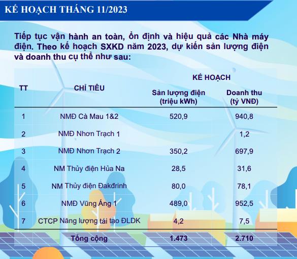 Bước sang tháng 11/2023, Công ty PV Power dự kiến tổng doanh thu từ các nhà máy là 2.710 tỷ đồng, tăng 21% so với tháng trước đó và giảm 1,7% so với cùng kỳ năm trước.