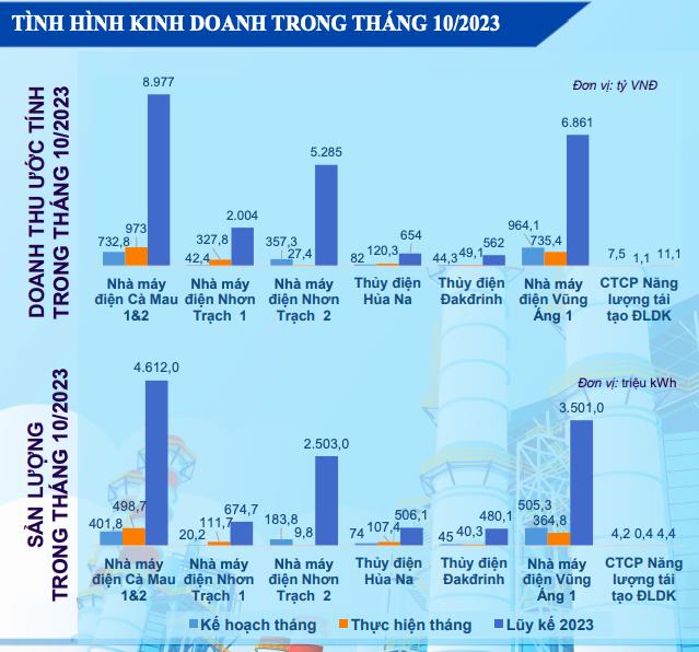 Trong đó, doanh thu từ Nhà máy điện Cà Mau 1&2 đóng góp nhiều nhất với 973 tỷ đồng, theo sau đó là Nhà máy điện Vũng Áng 1 với 735,4 tỷ đồng.