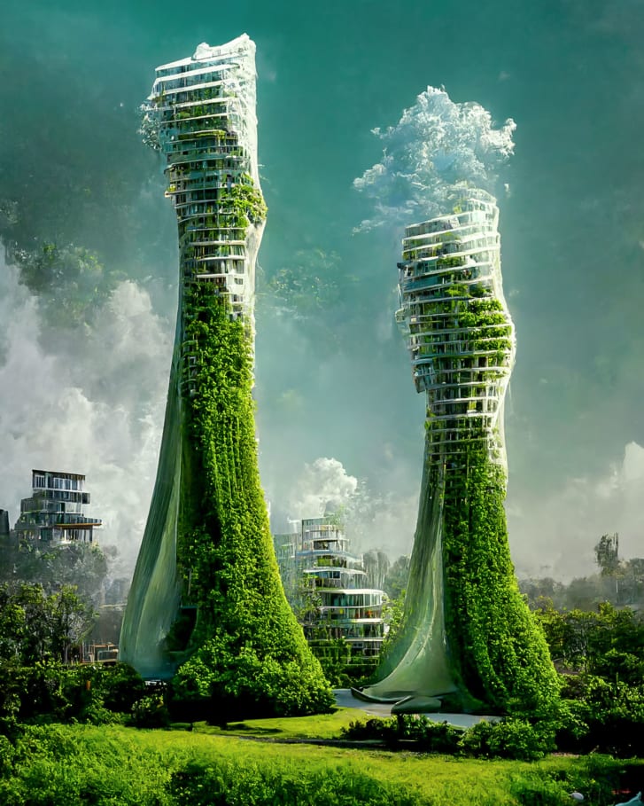 Vẫn là các tòa nhà chọc trời được bao phủ bởi cây xanh để thanh lọc không khí cùng thiết kế mở để thoáng gió, điểm khác biệt trong thiết kế của Manas Bhatia là nó được tạo nên bởi trí tuệ nhân tạo.