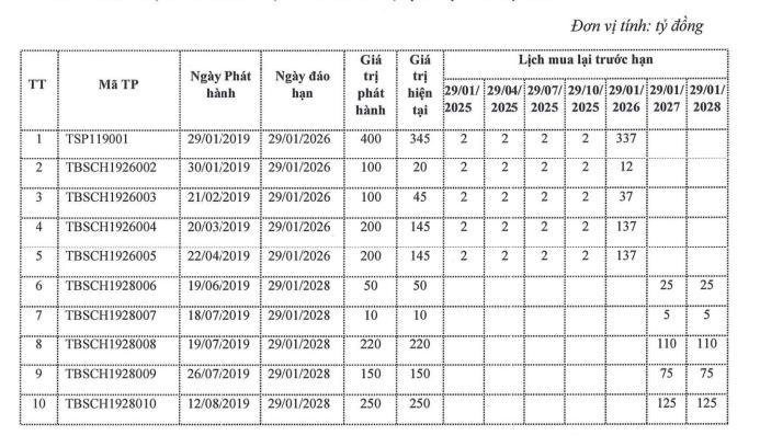 Trong đó, tổng giá trị phát hành 12 trái phiếu lên tới 2.100 tỷ đồng, dư nợ còn lại 1.800 tỷ đồng và trong năm 2025 sẽ lên kế thực hiện 4 đợt mua lại trái phiếu trước hạn vào ngày 29/1, 29/4, 29/7 và 29/10/2025 với tổng giá trị là 40 tỷ đồng.
