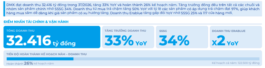 Theo báo cáo đề cập, DMX ghi nhận doanh thu 32.400 tỷ đồng trong quý 1/2026, tăng 33% so với cùng kỳ năm trước và hoàn thành 26% kế hoạch năm nay.