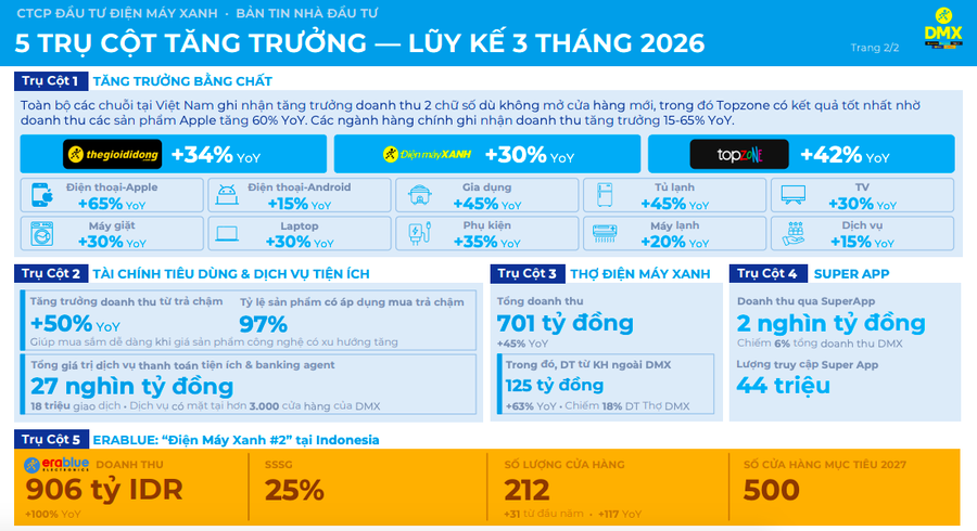 Theo DMX, 5 trụ cột kinh doanh tiếp tục duy trì đà tăng trưởng tích cực trong quý I/2026, phản ánh sự phục hồi rõ nét của sức mua cũng như hiệu quả vận hành.