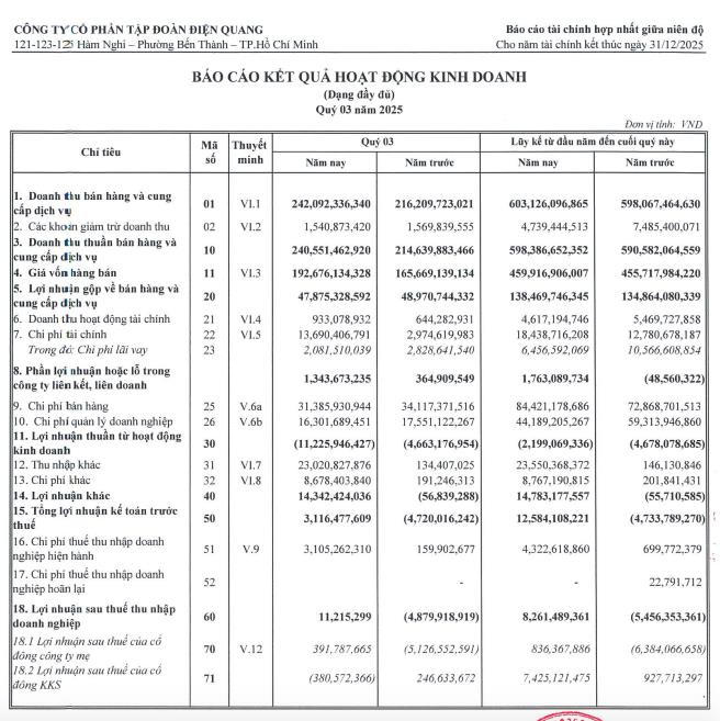 Trong quý III/2025, Điện Quang báo lãi sau thuế ghi nhận ở 11,2 triệu đồng, cải thiện hơn so với khoản lỗ 4,8 tỷ cùng kỳ năm 2024.