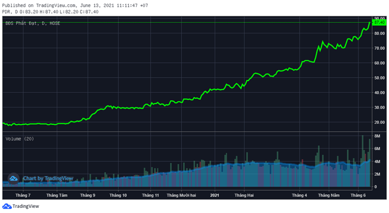 Thị trường chứng khoán thăng hoa thời gian qua tạo tiền đề cho nhiều Bluechips bứt phá mạnh mẽ trong đó có cổ phiếu PDR của Công ty Cổ phần Bất động sản Phát Đạt. Cổ phiếu này tăng bền bỉ và hiện đang lập đỉnh tại 87.400 đồng/cổ phiếu, ghi nhận mức tăng ấn tượng hơn 350% so với thời điểm cách đây 1 năm.