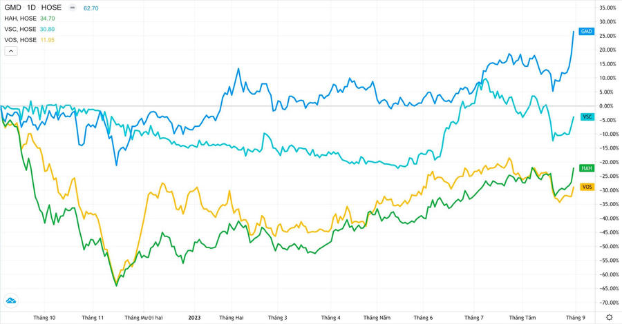 Sau thời gian có phần “im hơi, lặng tiếng”, nhóm cổ phiếu vận tải biển vừa bất ngờ có cú bứt tốc mạnh mẽ ngay trước kỳ nghỉ lễ 2/9. Các cổ phiếu như GMD, HAH, VSC, VOS,… đều tăng mạnh cùng giao dịch đầy sôi động. Cổ phiếu GMD đã leo lên lập đỉnh lịch sử mới trong khi HAH cũng trở lại đỉnh 11 tháng,...