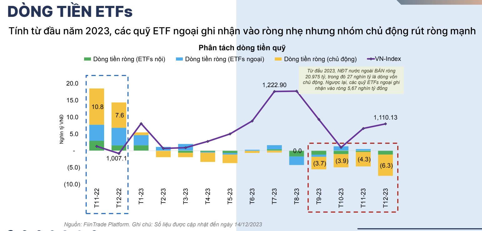 Thống kê mới nhất của FiinGroup cho thấy, vào cuối năm 2022, dòng tiền giữa ETF và các quỹ chủ động vào thị trường khá đều. Tuy nhiên, kể từ tháng 9/2023, dòng tiền bán ròng tập trung ở các nhóm chủ động, ngược chiều ETF lại hút ròng. Tính riêng số liệu đến 14/12/2023, xu hướng rút ròng tập trung chủ yếu ở dòng tiền chủ động nước ngoài với giá trị rút ròng hơn 6.300 tỷ đồng . Lũy kế từ đầu năm 2023 đến nay, giá trị rút ròng tại nhóm quỹ chủ động là 27.000 tỷ đồng.