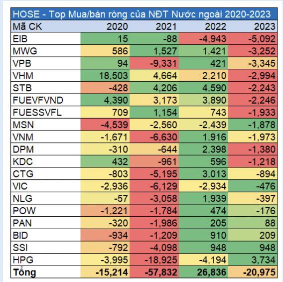 Thống kê về dòng tiền khối ngoại tại hội thảo có chủ đề "Đi lên từ chân sóng" do FIDT và FiinTrade tổ chức, bà Trương Minh Trang - đại diện FiinTrade (Fiin Group) cho biết, trong năm 2023, khối NĐTNN bán ròng 20.900 tỷ với top bán ròng gồm nhiều cổ phiếu được mua mạnh ở những năm trước (EIB, VPB, STB, MWG, VHM, VNM, DPM, KDC…).