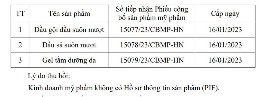 Cụ thể, 3 sản phẩm bị thu hồi gồm: Dầu gội đầu suôn mượt (số tiếp nhận Phiếu công bố sản phẩm mỹ phẩm 15077/23/CBMP-HN); Dầu sả suôn mượt (số tiếp nhận 15078/23/CBMP-HN) và Gel tắm dưỡng da (số tiếp nhận 15079/23/CBMP-HN), đều được cấp ngày 16/01/2023. Các sản phẩm được sản xuất tại Ô CN08, cụm công nghiệp Nguyên Khê, xã Phúc Thịnh, TP Hà Nội.