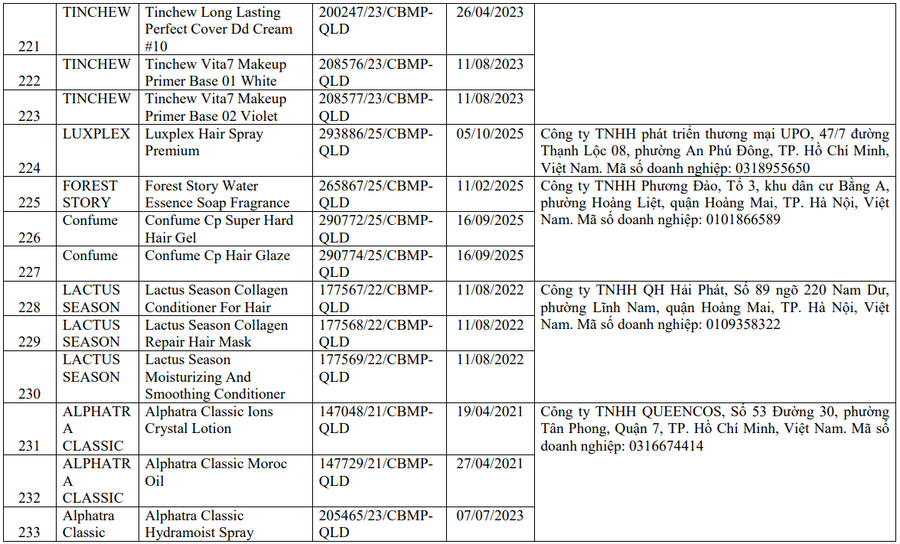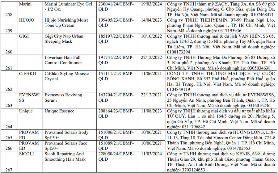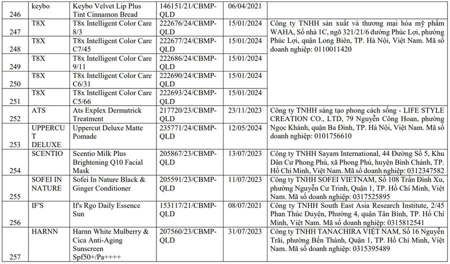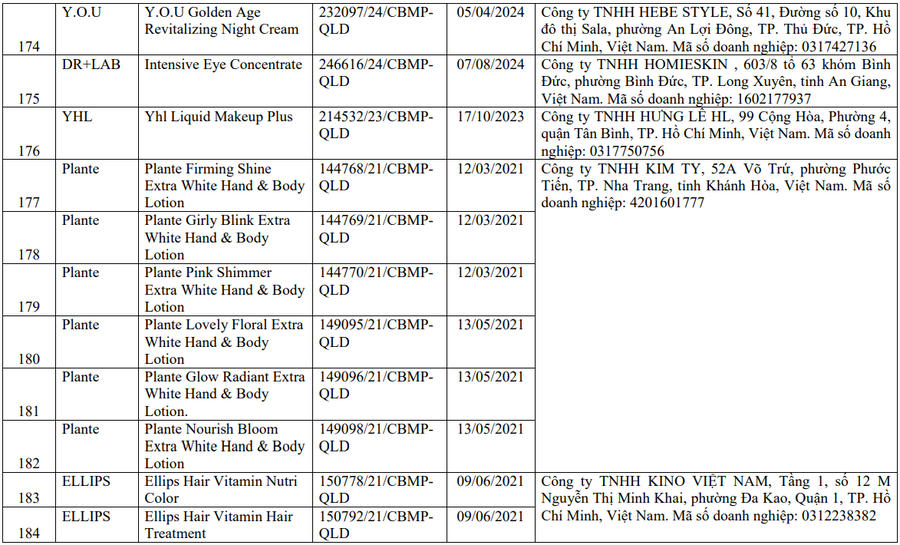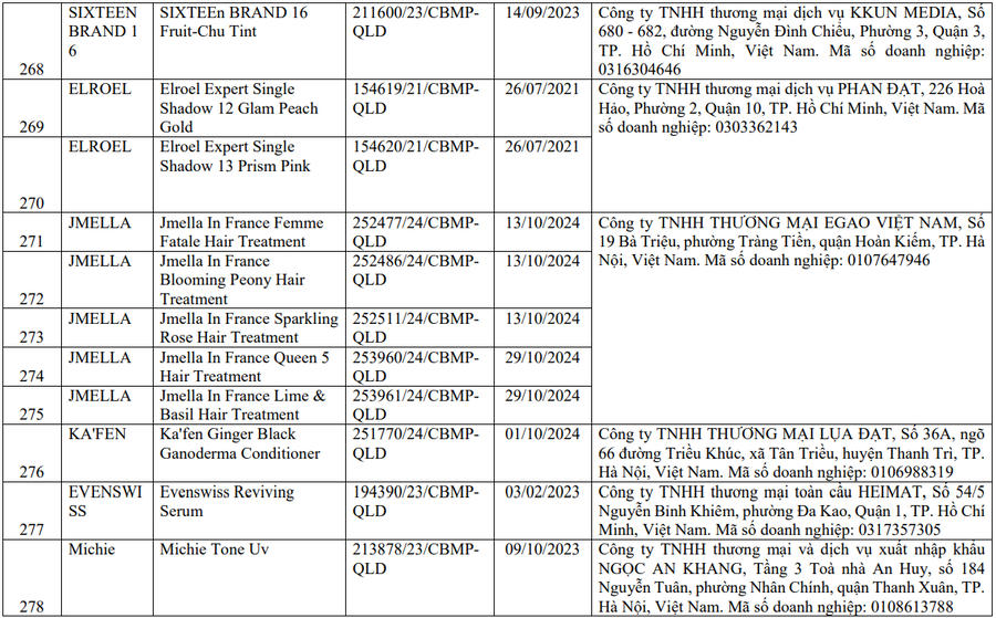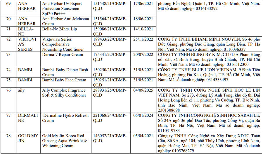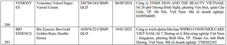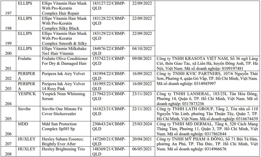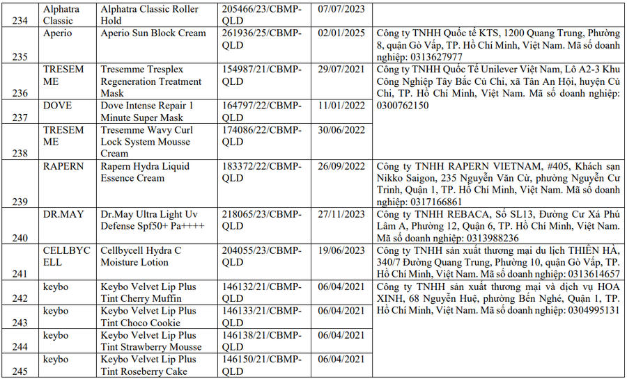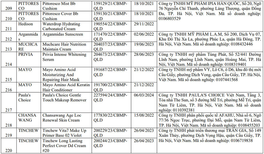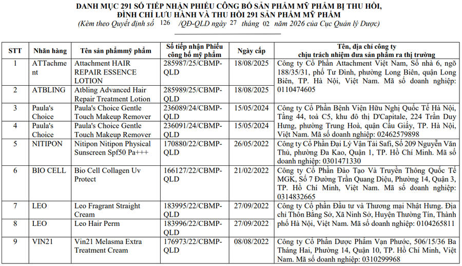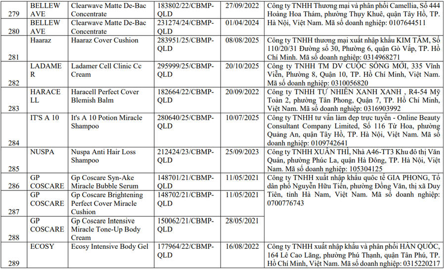 Danh sách 291 số tiếp nhận phiếu công bố sản phẩm mỹ phẩm bị thu hồi đình chỉ lưu hành và thu hồi 291 sản phẩm mỹ phẩm: