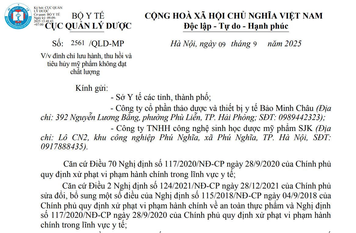 Hai doanh nghiệp liên quan là CTCP thảo dược và thiết bị y tế Bảo Minh Châu cùng Công ty TNHH công nghệ sinh học dược mỹ phẩm SJK có trách nhiệm thông báo thu hồi đến toàn bộ hệ thống phân phối, tiếp nhận sản phẩm trả lại từ khách hàng. Đồng thời tổ chức thu hồi và tiêu hủy đúng quy định. Báo cáo kết quả thu hồi, tiêu hủy phải được gửi về Cục Quản lý Dược trước ngày 04/10/2025.