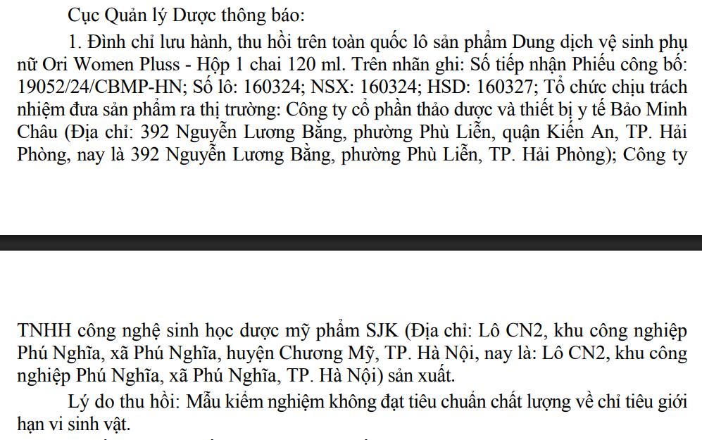 Cục Quản lý Dược (Bộ Y tế) vừa ban hành văn bản về việc đình chỉ lưu hành, thu hồi và tiêu hủy lô sản phẩm mỹ phẩm Dung dịch vệ sinh phụ nữ Ori Women Pluss - Hộp 1 chai 120 ml do không đạt tiêu chuẩn chất lượng trong kiểm nghiệm.