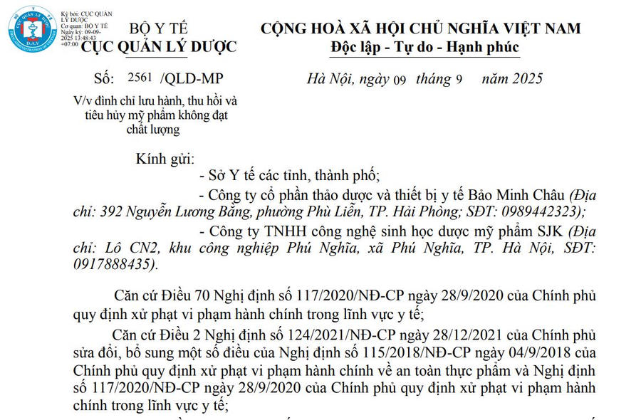 Cục cũng giao Sở Y tế TP Hải Phòng và Sở Y tế TP Hà Nội giám sát chặt chẽ việc thực hiện thu hồi và tiêu hủy của hai công ty, đồng thời kiểm tra, xử lý vi phạm (nếu có) trong hoạt động sản xuất, kinh doanh mỹ phẩm. Kết quả kiểm tra và giám sát phải được báo cáo về Cục Quản lý Dược trước ngày 19/10/2025.