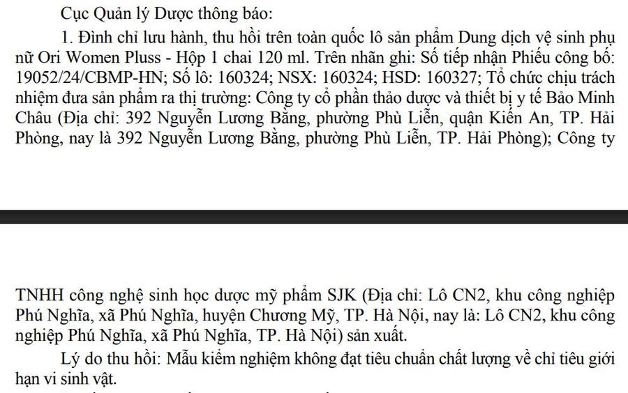 Lô sản phẩm bị thu hồi có số lô 160324, ngày sản xuất 16/3/2024, hạn sử dụng đến 16/3/2027. Trên nhãn sản phẩm ghi số tiếp nhận phiếu công bố 19052/24/CBMP-HN. Đơn vị chịu trách nhiệm đưa sản phẩm ra thị trường là CTCP thảo dược và thiết bị y tế Bảo Minh Châu (địa chỉ số 392 Nguyễn Lương Bằng, phường Phù Liễn, quận Kiến An, TP Hải Phòng, nay là 392 Nguyễn Lương Bằng, phường Phù Liễn, TP Hải Phòng). Đơn vị sản xuất là Công ty TNHH công nghệ sinh học dược mỹ phẩm SJK, (địa chỉ tại Lô CN2, khu công nghiệp Phú Nghĩa, xã Phú Nghĩa, huyện Chương Mỹ, TP Hà Nội, nay là Lô CN2, khu công nghiệp Phú Nghĩa, xã Phú Nghĩa, TP Hà Nội).