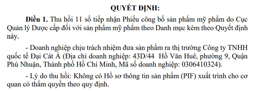 Cục Quản lý Dược (Bộ Y tế) vừa ra Quyết định đình chỉ lưu hành và thu hồi toàn quốc 22 sản phẩm mỹ phẩm của Công ty TNHH Quốc tế Đại Cát Á (địa chỉ: 43D/44 Hồ Văn Huê, phường Đức Nhuận, TP HCM - mã số doanh nghiệp 0306410324).