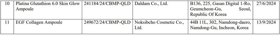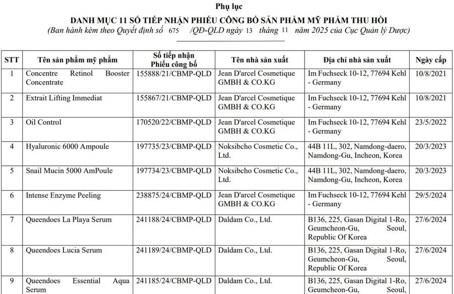 Theo Cục Quản lý Dược, các sản phẩm bị đình chỉ và thu hồi vì không có hoặc không xuất trình Hồ sơ thông tin sản phẩm (PIF) theo quy định khi cơ quan chức năng kiểm tra. Các sản phẩm bị thu hồi gồm: Queendoes Essential PDRN Serum, The Skin House Essential Wrinkle Collagen Toner, Black Pearl Peptide Patch, Snail Mucin 5000 Ampoule, Queendoes La Playa Serum, DR.IASO Triple-M Hydrating Cream, Dr.IASO Cica-Maca Cream, AHCare30%…