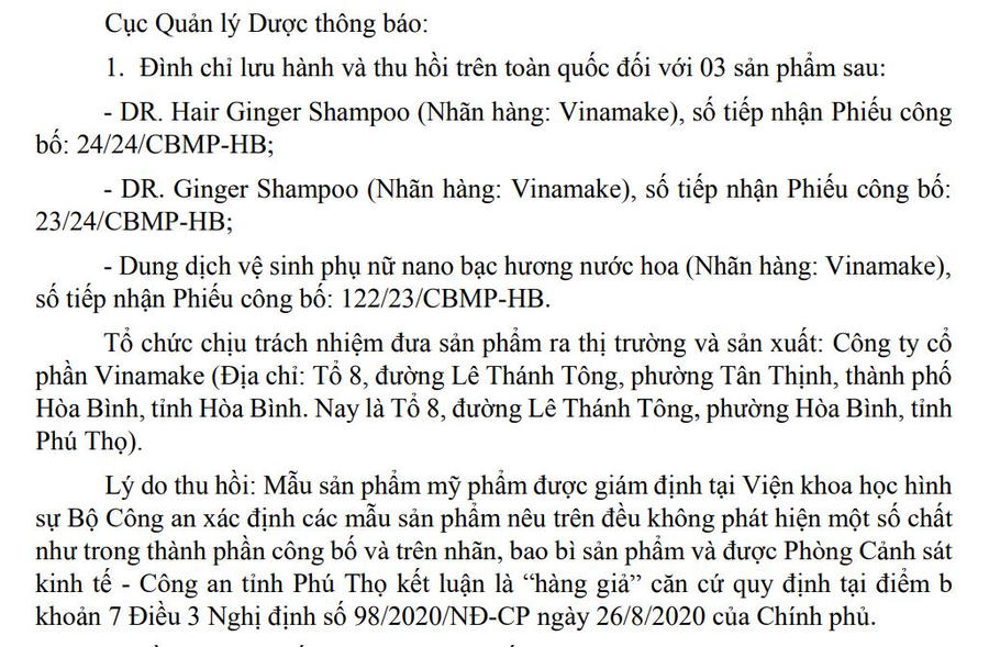 Cụ thể, 3 sản phẩm bị thu hồi gồm dầu gội DR. Hair Ginger Shampoo, số tiếp nhận Phiếu công bố (TNPCB) 24/24/CBMP-HB; dầu gội DR. Ginger Shampoo, số TNPCB 23/24/CBMP-HB; dung dịch vệ sinh phụ nữ nano bạc hương nước hoa, số TNPCB 122/23/CBMP-HB.