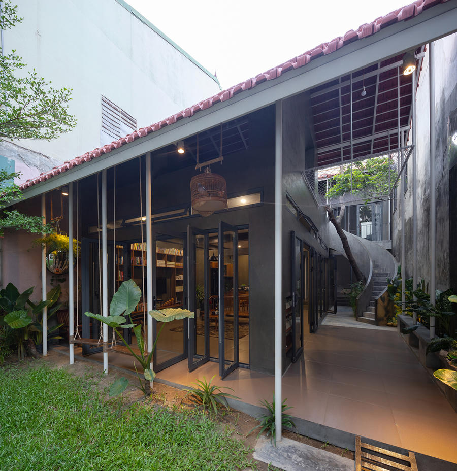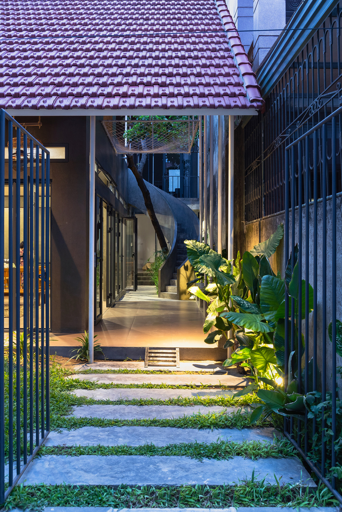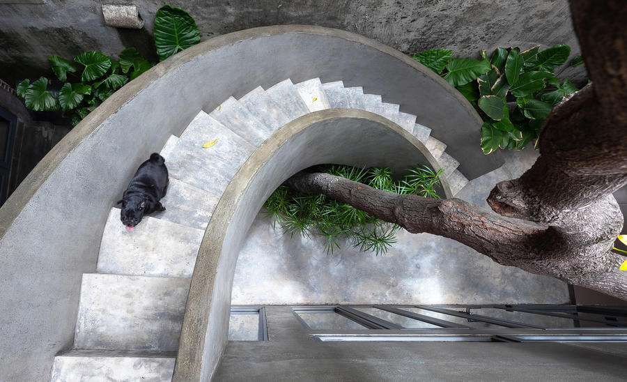 Cầu thang được xây dựng quanh một cây xanh lớn có sẵn từ đất nền cũ của ngôi nhà.