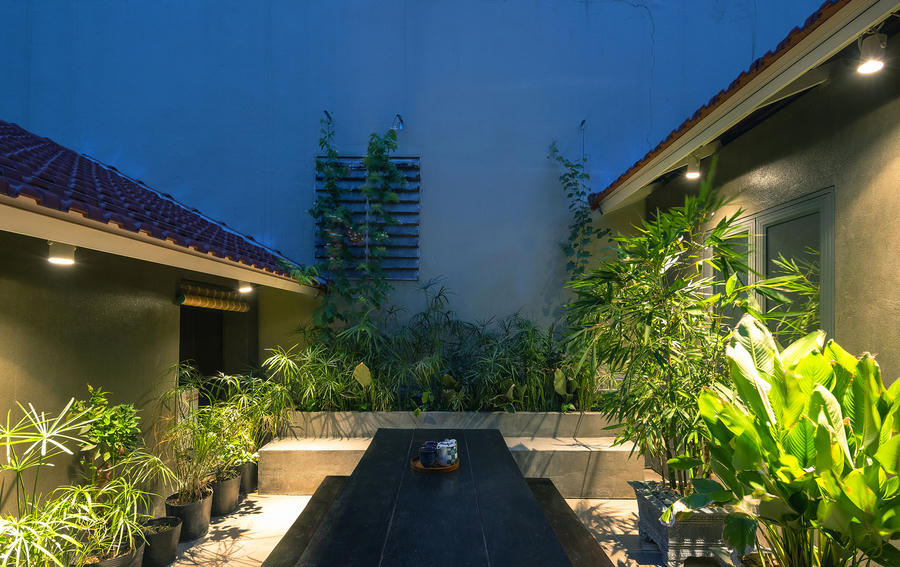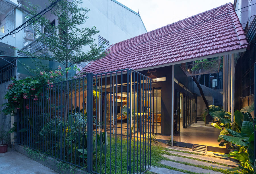 Cấu trúc của nhà vườn Coong được thiết kế tối giản, bao quanh bởi 3 khu sân chính: sân trước, sân giữa và sân mái. Phần mái ngói đỏ truyền thống và dốc hai chiều giúp tạo bẫy gió khiến căn nhà luôn mát mẻ, tầm nhìn không gian cũng được mở rộng.