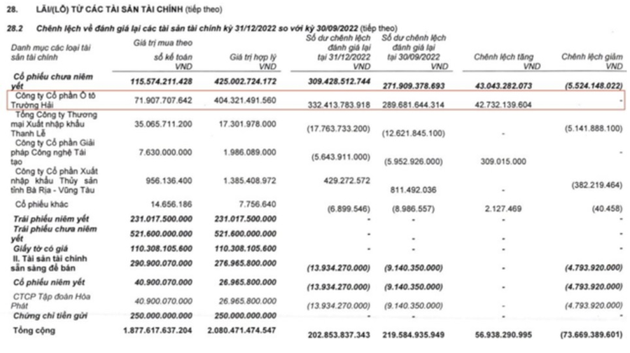 Tại thời điểm ngày 31/12/2022, VietinbankSc định giá khoản đầu tư vào Thaco ở mức 404,3 tỷ đồng, tăng 42,5 tỷ đồng so với cuối quý trước và cao gấp 5 lần giá trị ghi sổ.