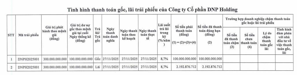 Theo đó, ngày 27/11/2025, DNP Holding đã thực hiện thanh toán 100 tỷ đồng tiền gốc và gần 2,2 tỷ đồng tiền lãi cho lô trái phiếu mã DNPH2025001, qua đó tất toán lô trái phiếu này đúng hạn.