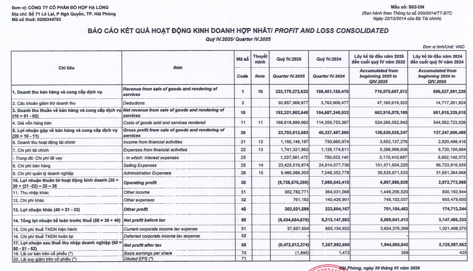 CTCP Đồ hộp Hạ Long (Halong Canfoco, mã ck: CAN) vừa công bố kết quả kinh doanh quý IV/2025 và cả năm 2025.