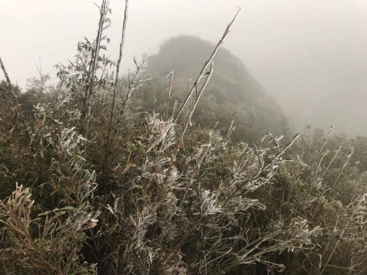 Sáng 2/4, cái rét tháng 3 đã phủ băng giá trắng khu vực đỉnh Fansipan. Hiện tượng băng giá khá muộn ở thời điểm cuối xuân đã đem đến bức tranh hoa băng kỳ thú cho du khách may mắn tới Fansipan dịp này.