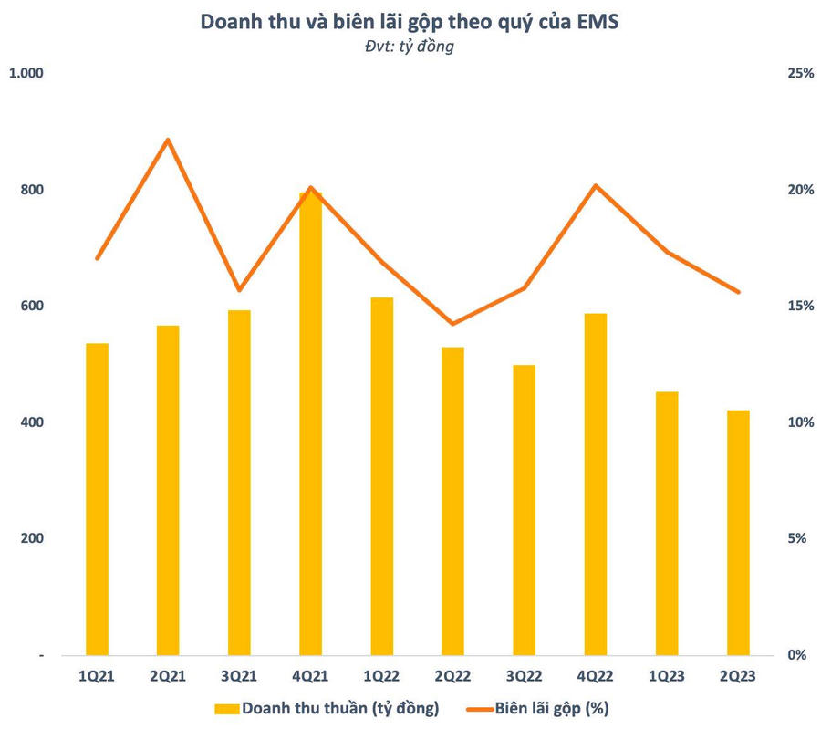 Tuy nhiên, nhờ khả năng quản lý chi phí hiệu quả, các chi phí bán hàng và chi phí quản lý doanh nghiệp trong quý 2 đều giảm lần lượt 32% và 18% so với cùng kỳ năm ngoái. Kết quả, EMS lãi ròng 5,3 tỷ đồng, khả năng hơn nhiều so với khoản lỗ 1,6 tỷ đồng quý 2/2022. Dù vậy, đây lại là mức lợi nhuận thấp nhất của doanh nghiệp này trong vòng 4 quý.