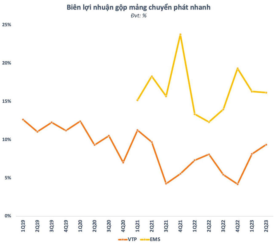Đặc biệt với Viettel Post, biên lợi nhuận gộp mảng dịch vụ chuyển phát đã có 2 quý liên tiếp tăng mạnh so với quý liền trước, lên mức 9,4% - cao nhất kể từ quý 2/2021. Trong khi đó, biên lãi gộp mảng này của EMS tiếp tục duy trì ở mức cao trên 16%.