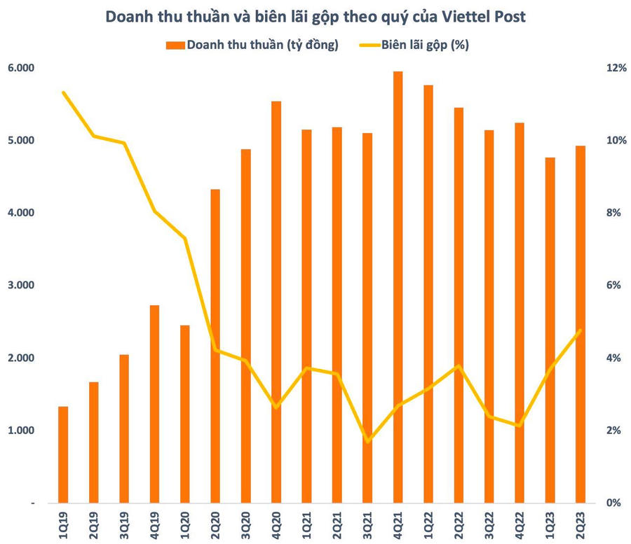 Theo báo cáo tài chính hợp nhất quý 2/2023, Tổng CTCP Bưu chính Viettel (Viettel Post – mã CK: VTP) ghi nhận doanh thu giảm 9,6% so với cùng kỳ năm ngoái. Tuy nhiên, biên lãi gộp đã được cải thiện từ mức 3,8% quý 2/2022 lên mức 4,8% - cao nhất kể từ quý 1/2020. Lợi nhuận gộp đạt 236 tỷ đồng, tăng 13,5% so với cùng kỳ năm ngoái.
