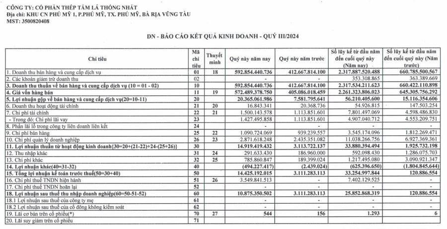 Công ty cổ phần Thép tấm lá Thống Nhất (TNFS, mã ck: TNS) vừa công bố báo cáo kinh doanh quý III/2024.