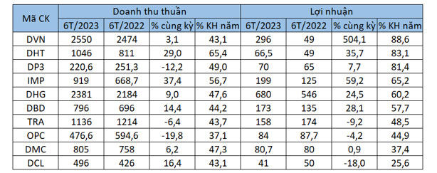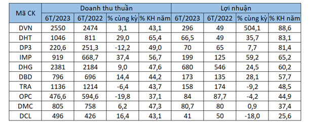 Qua nửa đầu năm, ngoại trừ Dược phẩm Cửu Long (HoSE: DCL) và Domesco (HoSE: DMC), các doanh nghiệp còn lại đều đang thực hiện đúng lộ trình, hoàn thành trên 45% chỉ tiêu lợi nhuận năm. Riêng Dược Việt Nam, nhờ hoạt động tài chính mà thực hiện được đến 87% kế hoạch lợi nhuận. Dược Hậu Giang, Imexpharm đạt trên 60% mục tiêu.