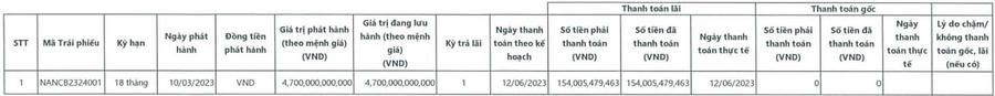 Dư nợ trái phiếu gần gần 4.700 tỷ đồng, tương ứng với giá trị lô trái phiếu NANCB2324001 vừa phát hành trong tháng 03/2023.