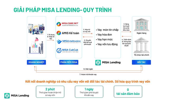 Tận dụng thế mạnh của mình trong việc phát triển các giải pháp chuyển đổi số Tài chính - Kế toán, MISA đưa vào triển khai nền tảng vay vốn tín chấp doanh nghiệp MISA Lending, nhằm kết nối các doanh nghiệp với các ngân hàng uy tín. Các doanh nghiệp đang sử dụng phần mềm kế toán, hoá đơn điện tử… của MISA có thể thực hiện vay vốn Online 100% cách thuận tiện và nhanh chóng mà không cần tài sản đảm bảo. Theo đánh giá của các ngân hàng, tỷ lệ vay vốn thành công qua nền tảng MISA Lending cao gấp 8 lần so với hình thức vay vốn truyền thống. Điều này cho thấy MISA Lending đem lại lợi ích rất lớn cho các doanh nghiệp, đặc biệt là các doanh nghiệp vừa và nhỏ trong việc tiếp cận nguồn vốn để phát triển kinh doanh.