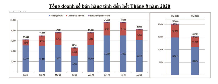 Doanh số bán hàng của toàn thị trường tháng 8 đạt 20.655 xe, bao gồm 15.419 xe du lịch, 4.966 xe thương mại và 270 xe chuyên dụng. Doanh số xe du lịch giảm 12%, xe thương mại giảm 19% và xe chuyên dụng giảm 20% so với tháng 7.