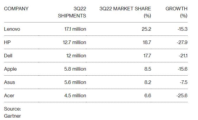 Lenovo Group Ltd. vẫn là nhà sản xuất PC hàng đầu thế giới trong quý III dù cho lượng hàng hóa xuất xưởng của hãng đã giảm khoảng 15% so với cùng kỳ năm trước, theo số liệu của Gartner. Trong số 5 nhà cung cấp PC hàng đầu thế giới hiện nay, HP Inc có mức sụt giảm doanh số lớn nhất trong quý III với mức giảm lên tới gần 28% so với quý III/2021.