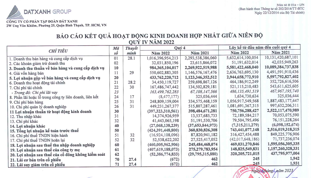 Kết quả là, Đất Xanh ghi nhận khoản lỗ sau thuế 460 tỷ đồng trong 3 tháng cuối năm 2022.