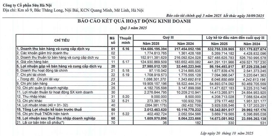 CTCP Sữa Hà Nội (Hanoimilk, mã ck: HNM) vừa công bố báo cáo tài chính quý III/2025 và kết quả 9 tháng đầu năm.