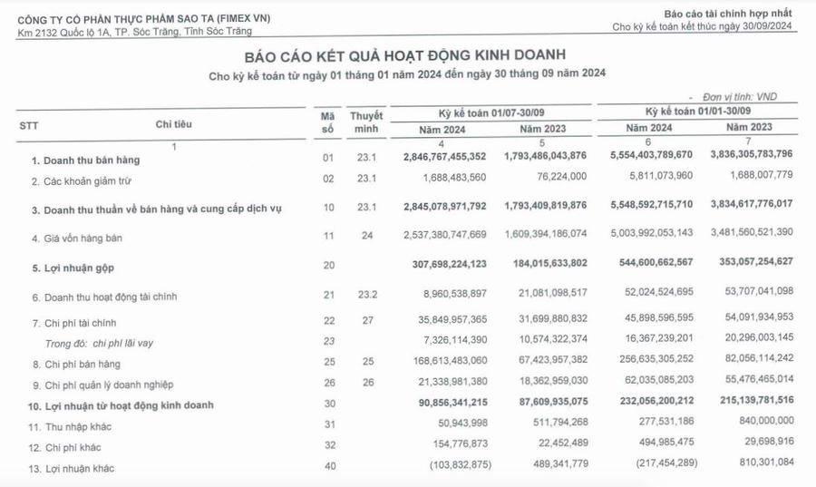 Trước đó, Thực phẩm Sao Ta đã công bố kết quả kinh doanh quý III/2024 với doanh thu thuần đạt 2.845 tỷ đồng, tăng 58,6% so với cùng kỳ năm trước. Giá vốn hàng bán cũng tăng cao lên mức 2.537 tỷ đồng so với con số 1.609 tỷ đồng ghi nhận ở quý III/2023. Lợi nhuận gộp của Sao Ta cũng tăng mạnh từ 184 tỷ đồng lên mức 307,6 tỷ đồng.