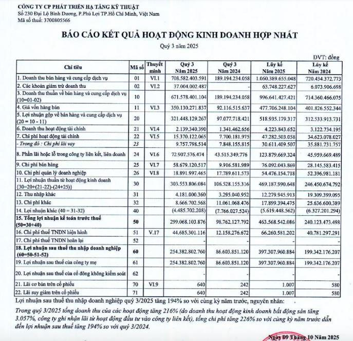 CTCP Phát triển Hạ tầng Kỹ thuật (Becamex IJC, mã ck: IJC) vừa công bố báo cáo kinh doanh hợp nhất quý III/2025 với kết quả ấn tượng.