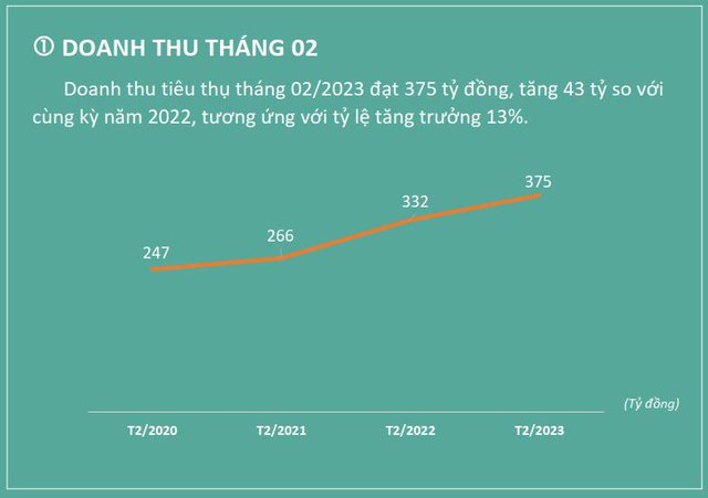 Lũy kế doanh thu tiêu thụ đến tháng 2/2023 đạt 771 tỷ đồng, tương ứng 92% lũy kế doanh thu tiêu thụ cùng kỳ năm 2022.